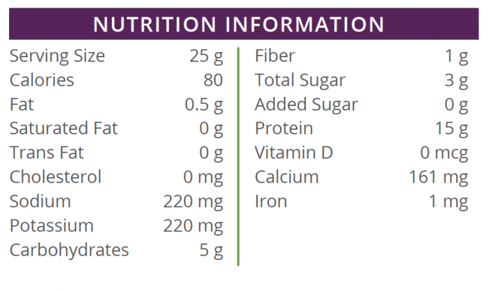 110 Calories | Protein: 15 grams | 1 Fiber | Sugar: 2 grams