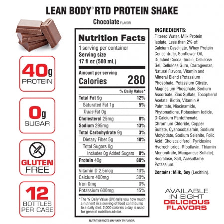 Lean Body RTDs provide high-quality protein without sugar or gluten. The protein in Lean Body RTDs provides nutritional support for lean muscle in a convenient shake with a delicious, creamy taste that hits the spot every time. Lean Body RTDs can help you manage your weight by helping curb appetite and food cravings. The protein in Lean Body can help you feel more full and satisfied.